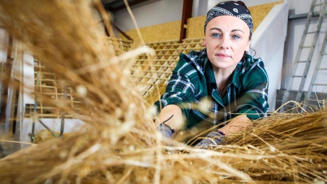 "That's it, start at the eaves and work from there," said the 72-year-old, peering upwards as a student laid and fixed batches of flax straw on top of a purpose-built model house.