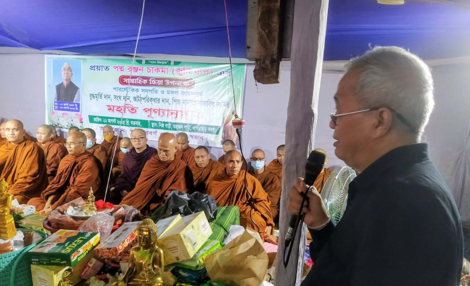Nipun Chakma, son of the late Padmaranjan Chakma, delivered a heartfelt tribute to his father and conducted the ceremony.