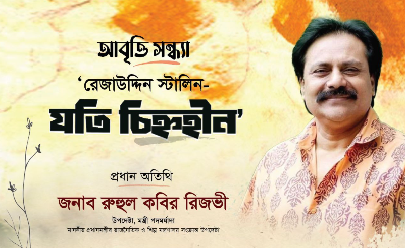 বিশ্বসাহিত্য কেন্দ্র মিলনায়তনে আজ শনিবার অনুষ্ঠিত রেজাউদ্দিন স্টালিন 'যতি চিহ্নহীন’ শীর্ষক এই কবিতা আবৃত্তি অনুষ্ঠানে কবির কবিতা থেকে আবৃত্তি করা হয়। কবিতা আবৃত্তি করেন সীমা ইসলাম, টিটো মুন্সী, এনামুল হক জুয়েল, ইকবাল আহমেদ, ফারহানা তৃণা, মাহিনুর মুমু, মাহবুবুর রহমান টুনু, ফারজানা আলী, মাহী ফারহানা নাজিয়া আফরিন।