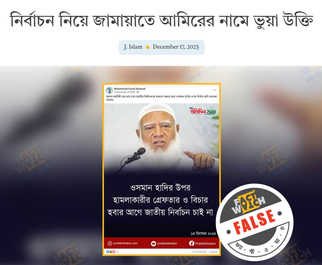 ঢাকা, ১৭ ডিসেম্বর, ২০২৫ (বাসস) : বাংলাদেশ জামায়াতে ইসলামীর আমির মন্তব্য করেননি এমন বক্তব্য ছড়িয়ে বিভ্রান্তি সৃষ্টির অপচেষ্টা শনাক্ত করেছে ফ্যাক্টওয়াচ।