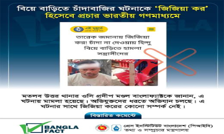 ঢাকা, ৩ মার্চ, ২০২৬ (বাসস) : বিয়ে বাড়িতে চাঁদাবাজির একটি ঘটনাকে ‘জিজিয়া কর’ হিসেবে উপস্থাপন করে ভারতীয় গণমাধ্যমে বিভ্রান্তিকর প্রচার চালানো হয়েছে বলে শনাক্ত করেছে প্রেস ইনস্টিটিউট বাংলাদেশ (পিআইবি)’র ফ্যাক্ট-চেক ও মিডিয়া রিসার্চ টিম ‘বাংলাফ্যাক্ট’।
