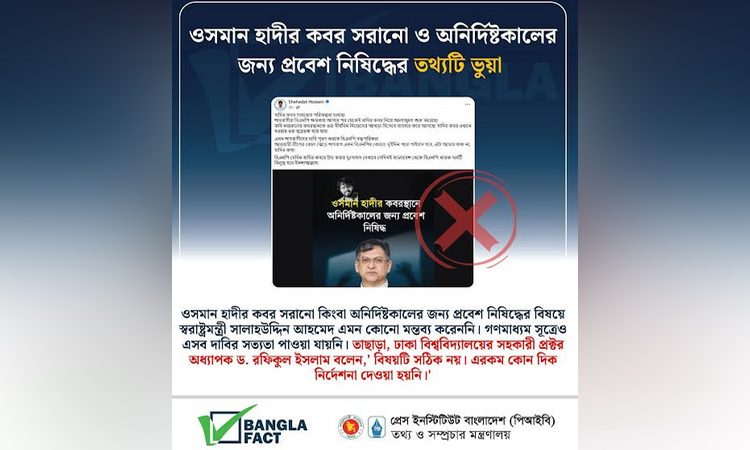 বাংলাফ্যাক্ট জানায়, ওসমান হাদীর কবর সরানো ও অনির্দিষ্টকালের জন্য সেখানে প্রবেশ নিষিদ্ধের তথ্যটি ভুয়া বলে শনাক্ত করা হয়েছে।