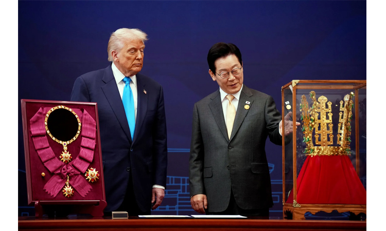 ঐতিহাসিক দক্ষিণ কোরিয়ার রাজধানী গিয়ংজুতে এক জাঁকজমকপূর্ণ স্বাগত অনুষ্ঠানের সমাপ্তি ঘটিয়ে, ট্রাম্পকে সিল্লার রাজাদের পরা মুকুটের একটি রেপ্লিকা উপহার দেওয়া হয়।