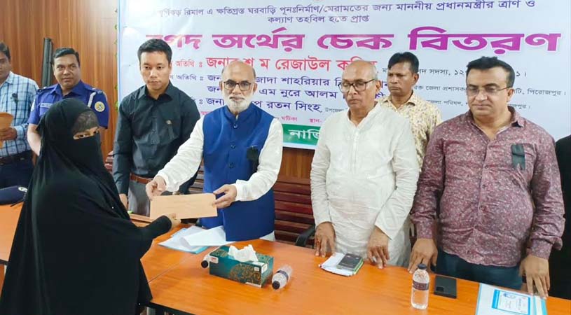 আজ প্রধান অতিথি হিসেবে উপস্থিত থেকে ঢেউটিন ও টাকা বিতরণ করেন মৎস্য ও প্রাণিসম্পদ মন্ত্রণালয় সম্পর্কিত সংসদীয় স্থায়ী কমিটির সভাপতি শ ম রেজাউল করিম এমপি। তিনি নাজিরপুর উপজেলার ক্ষতিগ্রস্ত ১০১টি পরিবারের প্রত্যেকটির মধ্যে এক বান্ডিল ঢেউটিন এবং গৃহ পুন:নির্মাণ ও মেরামত ব্যয় বাবদ ৫ হাজার টাকার চেক প্রদান করেন।