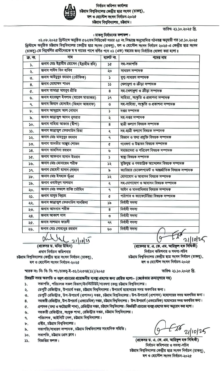 গ্যাজেটে উল্লেখ করা হয়েছে, চট্টগ্রাম বিশ্ববিদ্যালয়ের ৫৬২তম সিন্ডিকেট সভার ২৫ নম্বর সিদ্ধান্তে অনুমোদিত গঠনতন্ত্র অনুযায়ী গত ১৫ অক্টোবর অনুষ্ঠিত কেন্দ্রীয় ছাত্র সংসদ (চাকসু) নির্বাচন ২০২৫-এ নিম্নবর্ণিত প্রার্থীদের স্ব-স্ব নামের পাশে বর্ণিত পদে এক বছরের জন্য নির্বাচিত ঘোষণা করা হলো।