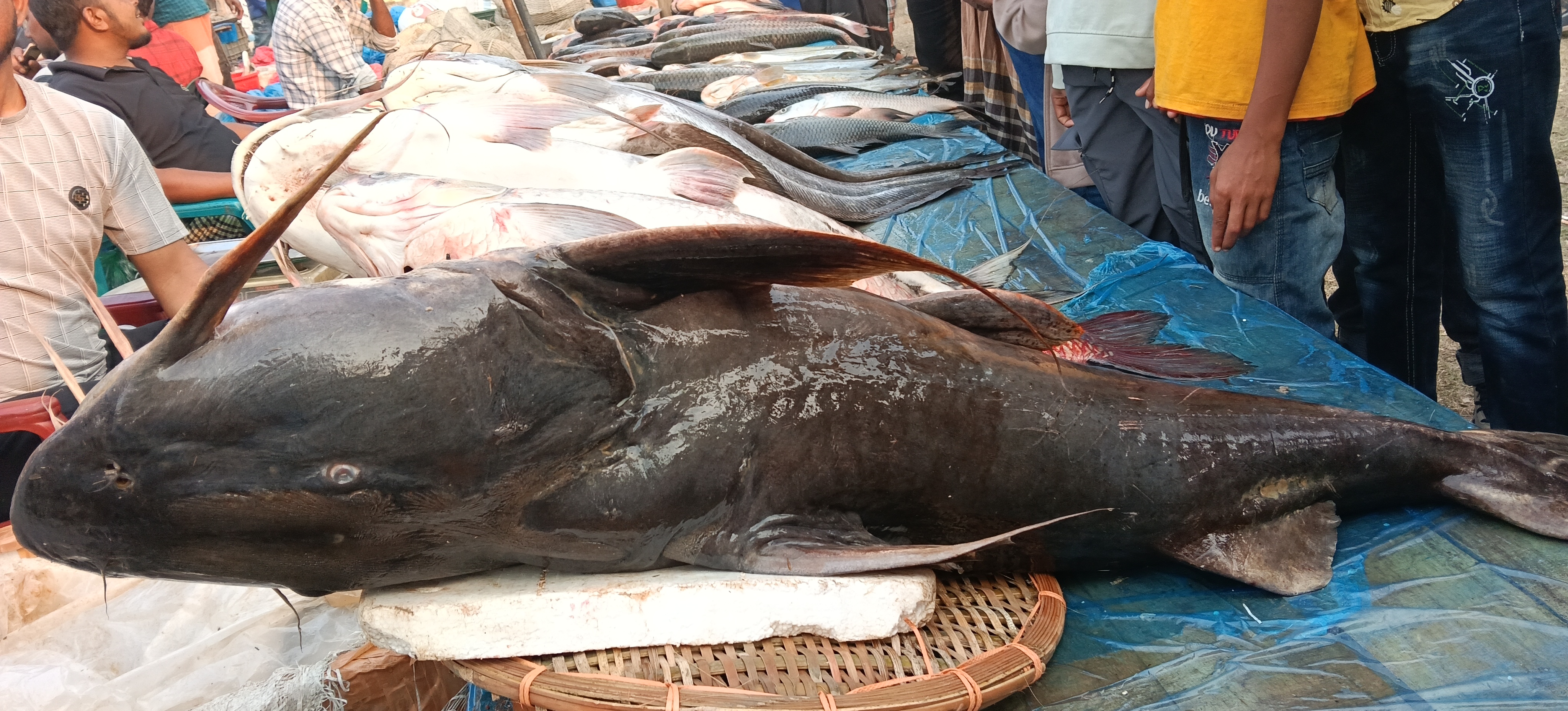 আব্দুল আজিজ নামে এক ব্যবসায়ীর মেলায় নিয়ে আসা একটি বাঘাই মাছের দাম হাকা হয়েছে আড়াই লাখ টাকা।