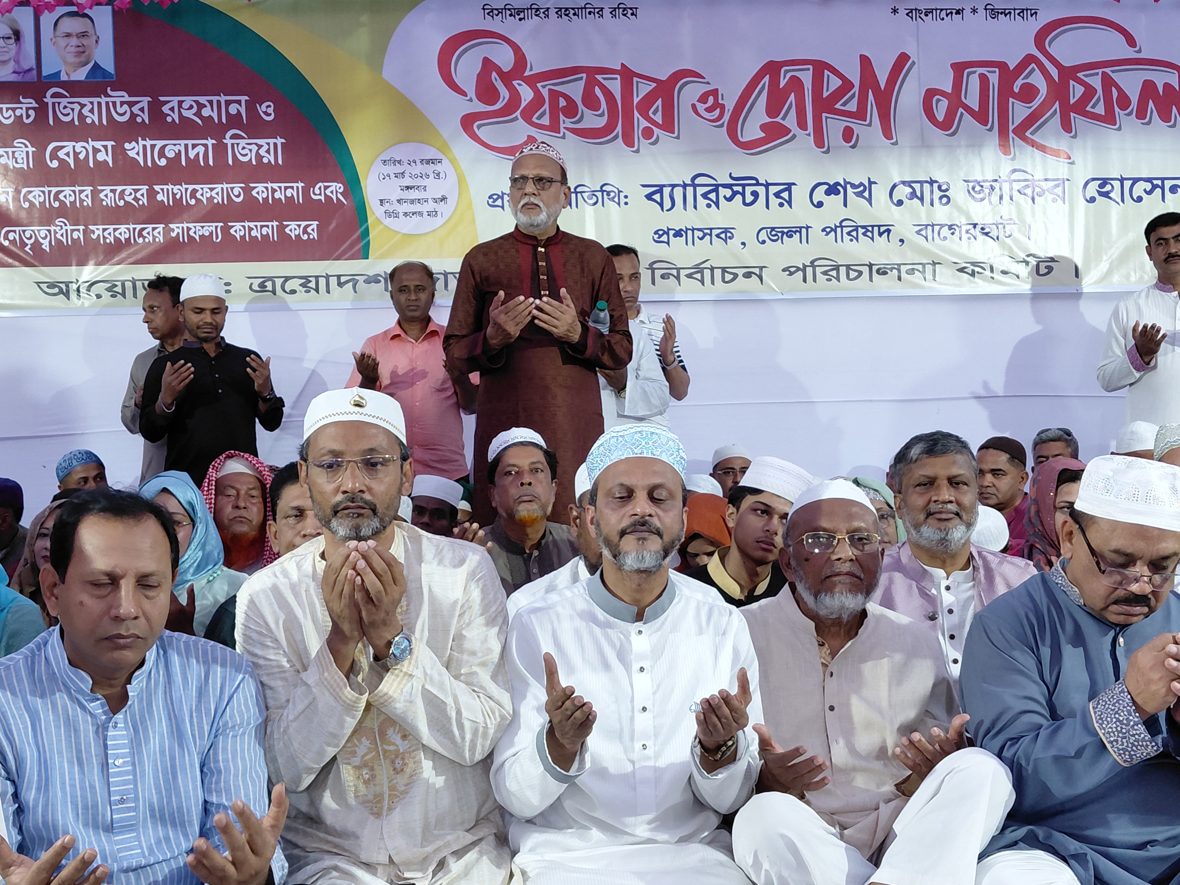 বাগেরহাট, ১৮ মার্চ, ২০২৬ (বাসস): ত্রয়োদশ জাতীয় সংসদ নির্বাচন পরিচালনা কমিটির আয়োজনে সাবেক রাষ্ট্রপতি শহীদ জিয়াউর রহমান, সাবেক প্রধানমন্ত্রী খালেদা জিয়া এবং আরাফাত রহমান কোকো’র রুহের মাগফেরাত কামনা এবং তারেক রহমান-এর নেতৃত্বাধীন সরকারের সাফল্য কামনায় মঙ্গলবার বিকেলে বাগেরহাটের খানজাহান আলী কলেজ মাঠে এক ইফতার ও দোয়া মাহফিল অনুষ্ঠিত হয়েছে।