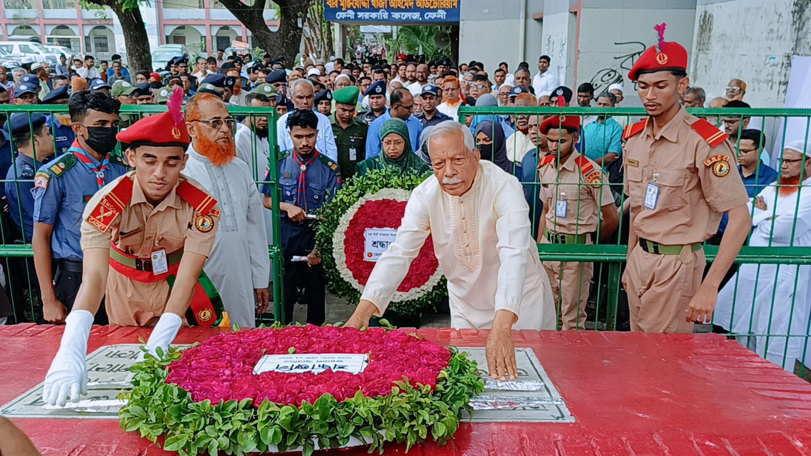 পরে জেলা পুলিশ সুপারের পক্ষে অতিরিক্ত পুলিশ সুপারবৃন্দ, সিভিল সার্জন ডা. রুবাইয়াত বিন করিম, জেলা পরিষদ, মুক্তিযোদ্ধা সন্তান কমান্ড, ফেনী সরকারি কলেজ, ফেনী সদর উপজেলা পরিষদ, ফেনী পৌরসভা, স্থানীয় সরকার প্রকৌশল অধিদপ্তর, শিক্ষা প্রকৌশল অধিদপ্তর, জনস্বাস্থ্য প্রকৌশল অধিদপ্তর, জেলা আনসার কমান্ড, জেলা কারাগার, জেলা কৃষি সম্প্রসারণ অধিদপ্তর, জয়নাল হাজারী কলেজ ও কলেজ ছাত্রদল পুষ্পস্তবক অর্পণ করে।