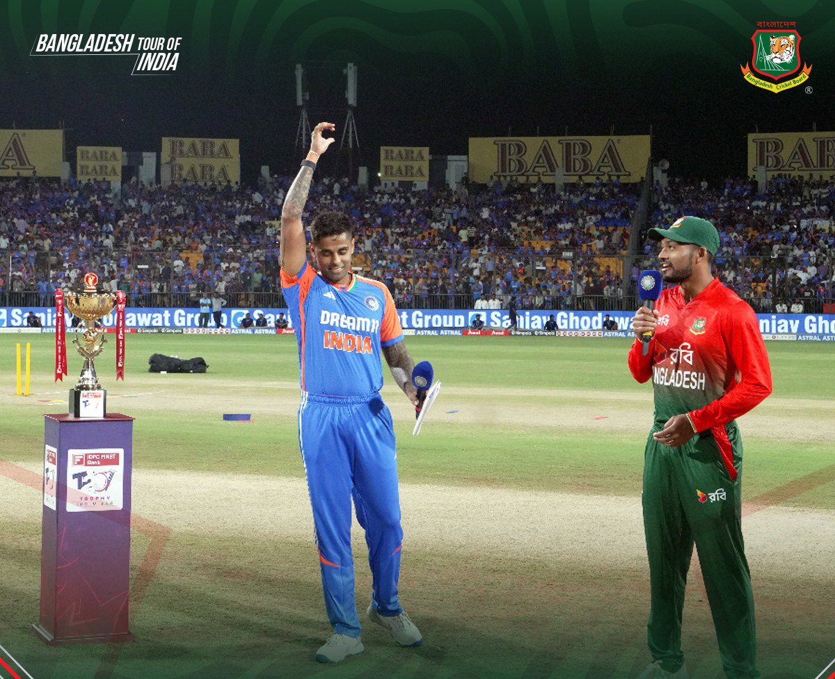 গোয়ালিয়র, ৬ অক্টোবর ২০২৪ (বাসস) : গোয়ালিয়রে তিন ম্যাচ টি-টোয়েন্টি সিরিজের প্রথমটিতে টস জয়ী ভারতীয় অধিনায়ক সূর্যকুমার যাদব সফরকারী বাংলাদেশকে প্রথমে ব্যাটিংয়ের আমন্ত্রন জানিয়েছেন।