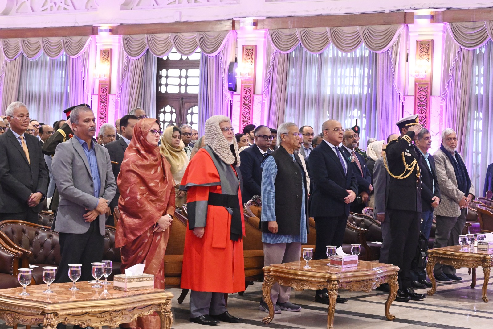 শপথ গ্রহণ অনুষ্ঠানে উপস্থিত ছিলেন অন্তর্বর্তী সরকারের প্রধান উপদেষ্টা নোবেলজয়ী অধ্যাপক মুহাম্মদ ইউনূস।
