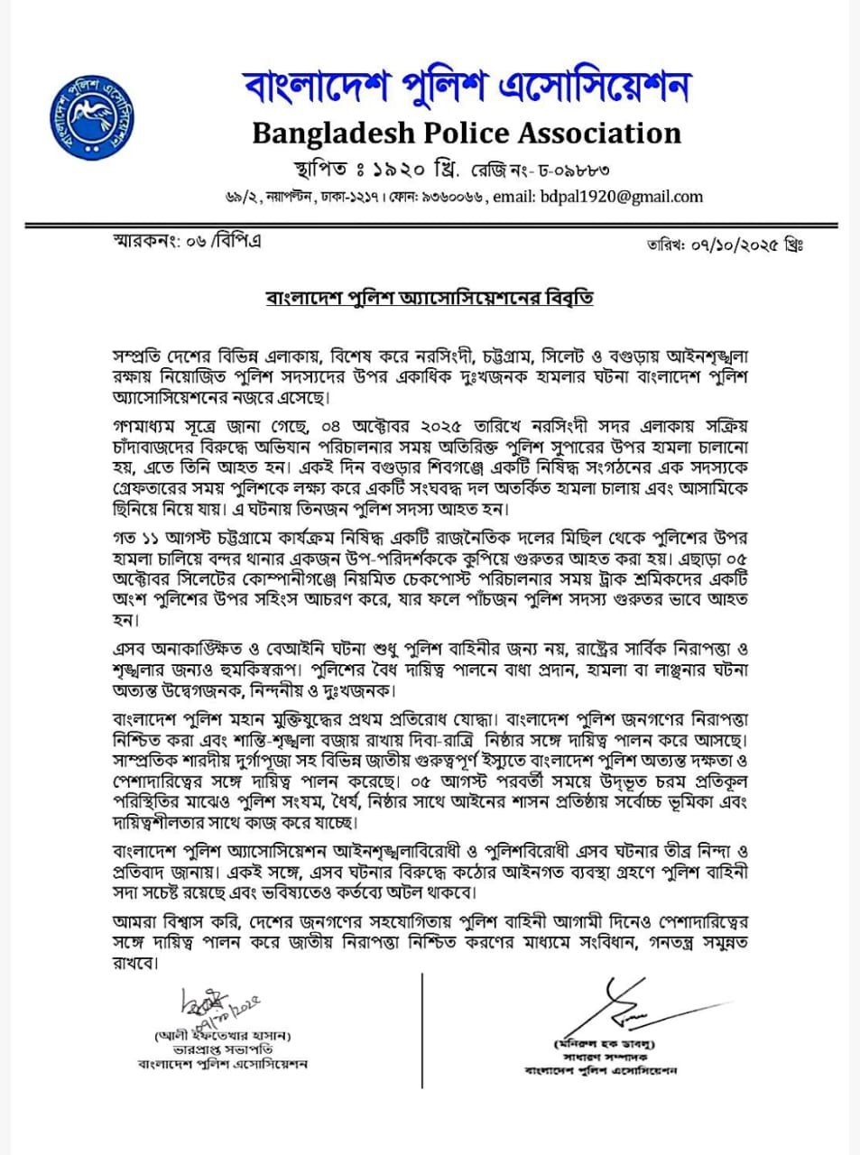 ঢাকা, ৭ অক্টোবর, ২০২৫ (বাসস) : বাংলাদেশ পুলিশ অ্যাসোসিয়েশন দেশের বিভিন্ন স্থানে পুলিশ সদস্যদের ওপর হামলার ঘটনায় তীব্র নিন্দা ও প্রতিবাদ জানিয়েছে। সম্প্রতি নরসিংদী, চট্টগ্রাম, সিলেট ও বগুড়ায় আইনশৃঙ্খলা রক্ষায় নিয়োজিত পুলিশ সদস্যদের ওপর হামলা চালায় দুস্কৃতিকারীরা।