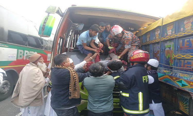ওই কলার বলেন, বাসটির সামনের অংশ দুমড়ে-মুচড়ে গিয়ে ভেতরে বেশ কিছু যাত্রী আটকে আছেন।