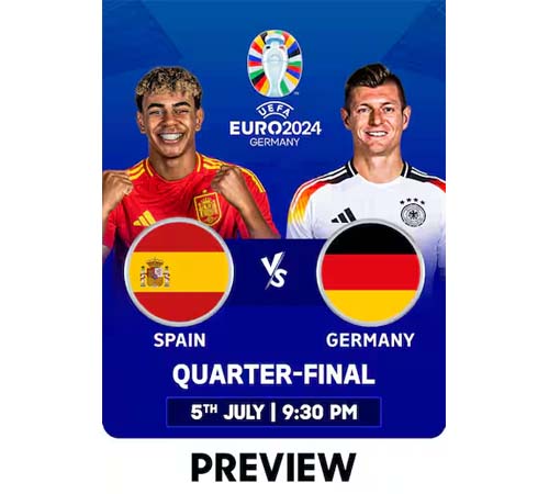 স্টুটগার্ট, ৪ জুলাই, ২০২৪ (বাসস/এএফপি) : আগামীকাল ইউরো চ্যাম্পিয়নশীপের প্রথম কোয়ার্টার ফাইনালে আসরের সবচেয়ে সফল দল স্পেনের মুখোমুখি হবে স্বাগতিক জার্মানি। ইউরোপের দুই ফুটবল পরাশক্তি চতুর্থবারের মত বৈশি^ক এই টুর্ণামেন্টের শিরোপা জয়ের লক্ষ্য নিয়ে মাঠে নেমেছে। একে অপরকে ছাড়িয়ে যেতে হলে নিজেদের সেরাটা দেবার বিকল্প নেই। ঘরের মাঠে জার্মানি বাড়তি সুবিধা পাবে, এটা মানতে নারাজ এখনো পর্যন্ত পয়েন্ট না হারানো স্পেন।