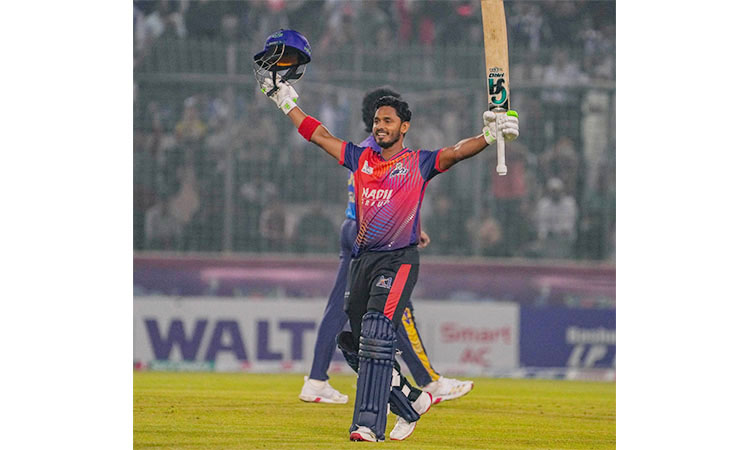ঢাকা, ২৩ জানুয়ারি, ২০২৬ (বাসস) : ওপেনার তানজিদ হাসান তামিমের সেঞ্চুরিতে বাংলাদেশ প্রিমিয়ার লিগ (বিপিএল) টি-টোয়েন্টি ক্রিকেটের দ্বাদশ আসরের ফাইনালে চট্টগ্রাম রয়্যালসকে জয়ের জন্য ১৭৫ রানের টার্গেট দিয়েছে রাজশাহী ওয়ারিয়র্স। প্রথমে ব্যাট করে ২০ ওভারে ৪ উইকেটে ১৭৪ রান করে রাজশাহী। ৬২ বলে ১০০ রান করেন তানজিদ।