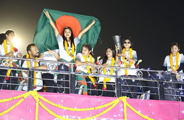 দেশে ফেরার পর বিমানবন্দরে ফুলেল শুভেচ্ছায় সিক্ত হন বাংলাদেশ নারী ফুটসাল দলের খেলোয়াড়রা। এরপর সেখান থেকে ছাদখোলা বাসে সাবিনা খাতুনের নেতৃত্বাধীন দলটিকে নিয়ে যাওয়া হয় হাতিরঝিলে এ্যাম্ফিথিয়েটারে। সেখানে বাংলাদেশ ফুটবল ফেডারেশনের পক্ষ থেকে সংবর্ধনা দেয়া হয় শিরোপা জয়ী দলটিকে।
