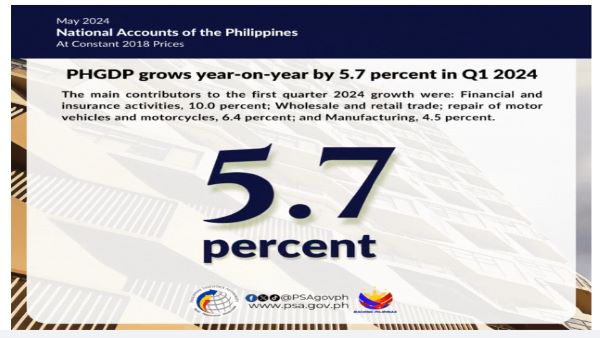 The 5.7 percent expansion in January-March was well down from the 6.4 percent posted in the same period last year earlier but a slight improvement on the previous three months, national statistician Dennis Mapa told reporters.