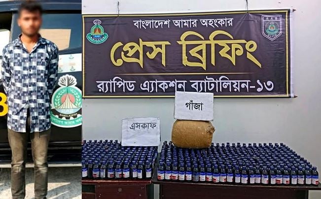 RANGPUR, Oct 28, 2025 (BSS) – Rapid Action Battalion (RAB)-13 seized 637 bottles of ESKuf and 4.15 kilograms of ganja and arrested an alleged drug peddler from Purba Kadma village under Hatibandha police station of Lalmonirhat today.