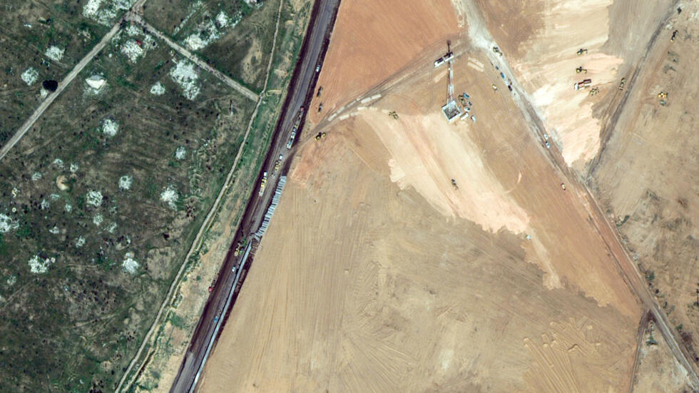 Sinai, showing machinery building a wall along the Egypt-Gaza border. The