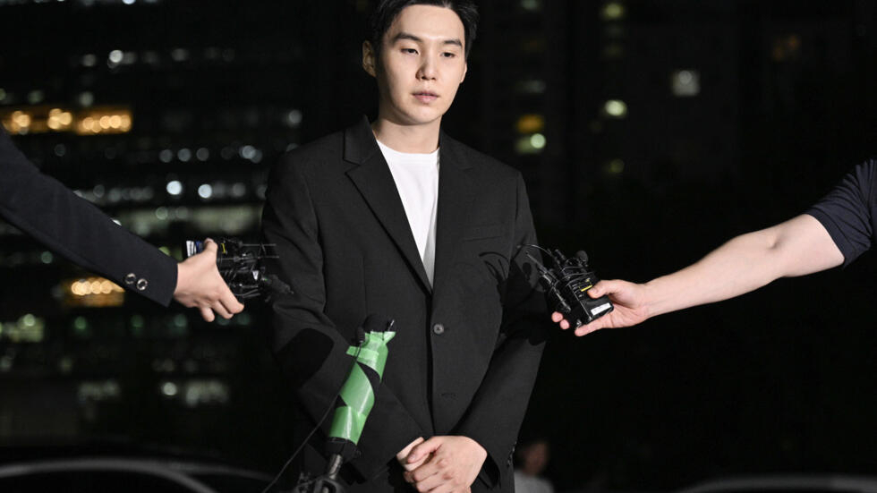 Wearing a black suit, SUGA bowed in front of journalists outside the police station in Seoul's fashionable Yongsan district.