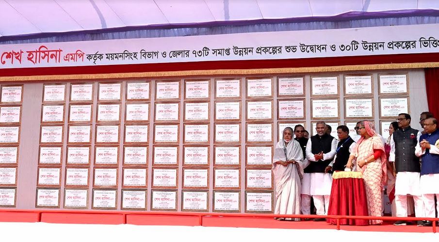 She inaugurated 73 development projects involving Taka 570.07 crore and laid foundation stones of 30 other schemes worth Tk 2,762.27 crore in Mymensingh Division, unveiling the plaque at a grand public rally held at the Circuit House ground in the afternoon.