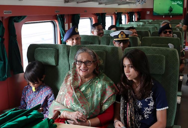 After launching the new train service, the premier along with her younger sister Sheikh Rehana took a ride on a special train from Mawa to attend a grand rally at Dr Kazi Abu Yusuf Stadium here.