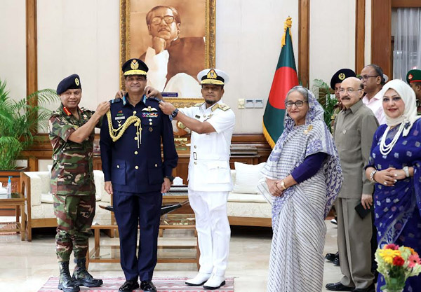 Chief of Army Staff General SM Shafiuddin Ahmed and Chief of Naval Staff Admiral M Nazmul Hassan adorned the new air chief with the rank badge of Air Marshal.