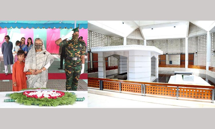 After laying the wreath, she stood in solemn silence for some time as a mark of profound respect to the memory of the architect of Bangladesh's independence.