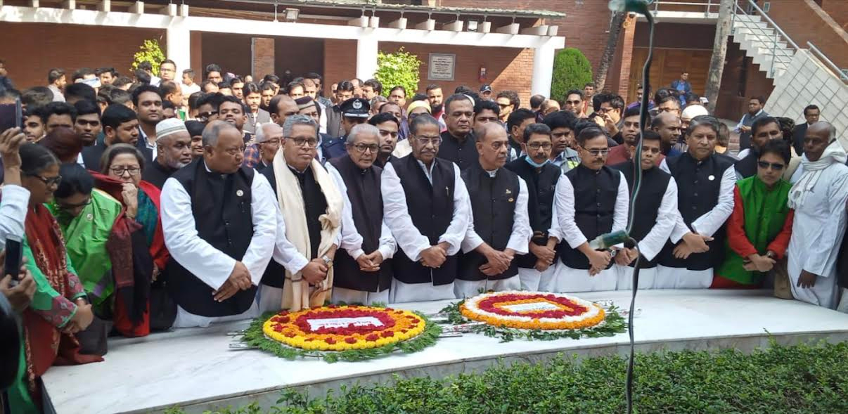 The delegation led by AL presidium member Lt. Col. Muhammad Faruk Khan, MP, and the central leaders of AL paid their glowing tributes to Bangabandhu by placing wreaths at the mausoleum.