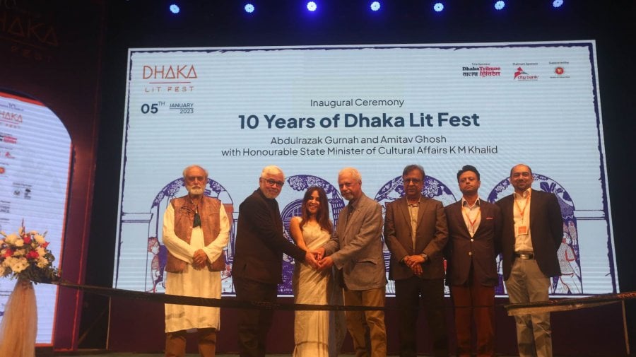 State Minister for Cultural Affairs KM Khalid, Nobel Laureate writer Abdulrazak Gurnah and eminent writer Amitav Ghosh joined the inaugural function of the four-day lit fest in the morning at Abdul Karim Sahitya Bisharad Hall of Bangla Academy here.