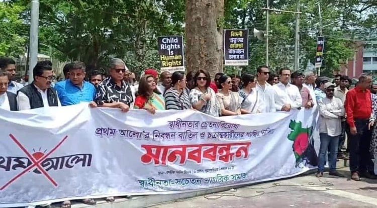 The protest rally, began with the performance of the National Anthem led by valiant freedom fighter and noted singer of Swadhin Bangla Betar Kendra Manoranjan Ghosal.
