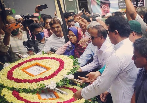 On behalf of the Information and Broadcasting Ministry, Md Humayun Kabir Khandaker paid tribute to noted film actor Farooque by placing wreath on his coffin.