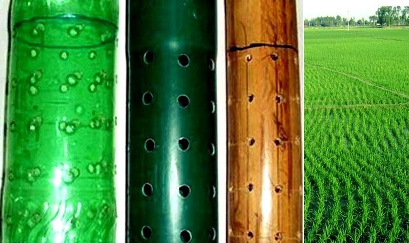 perforated PVC pipe or hollow bamboo piece or waste bottle of cold drinks to